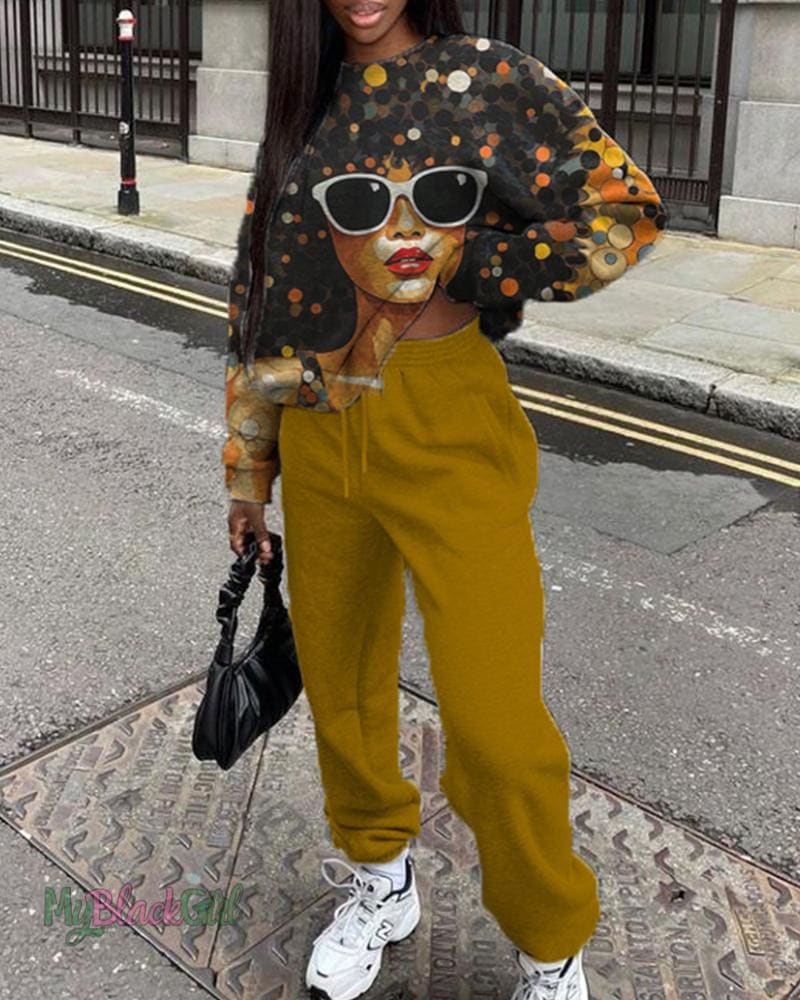 Black girl printed personalized casual loose round neck sweatshirt women's suit