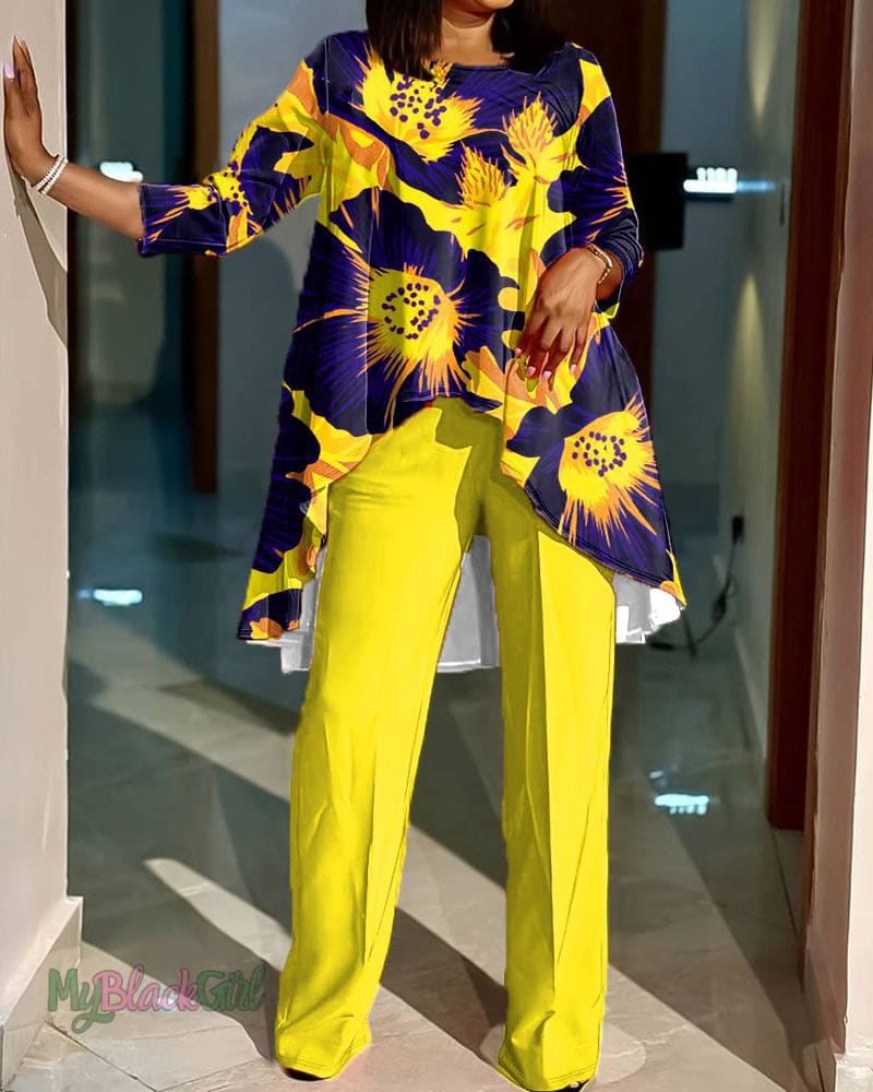 Bright Floral Print Irregular Long Sleeve Top Set