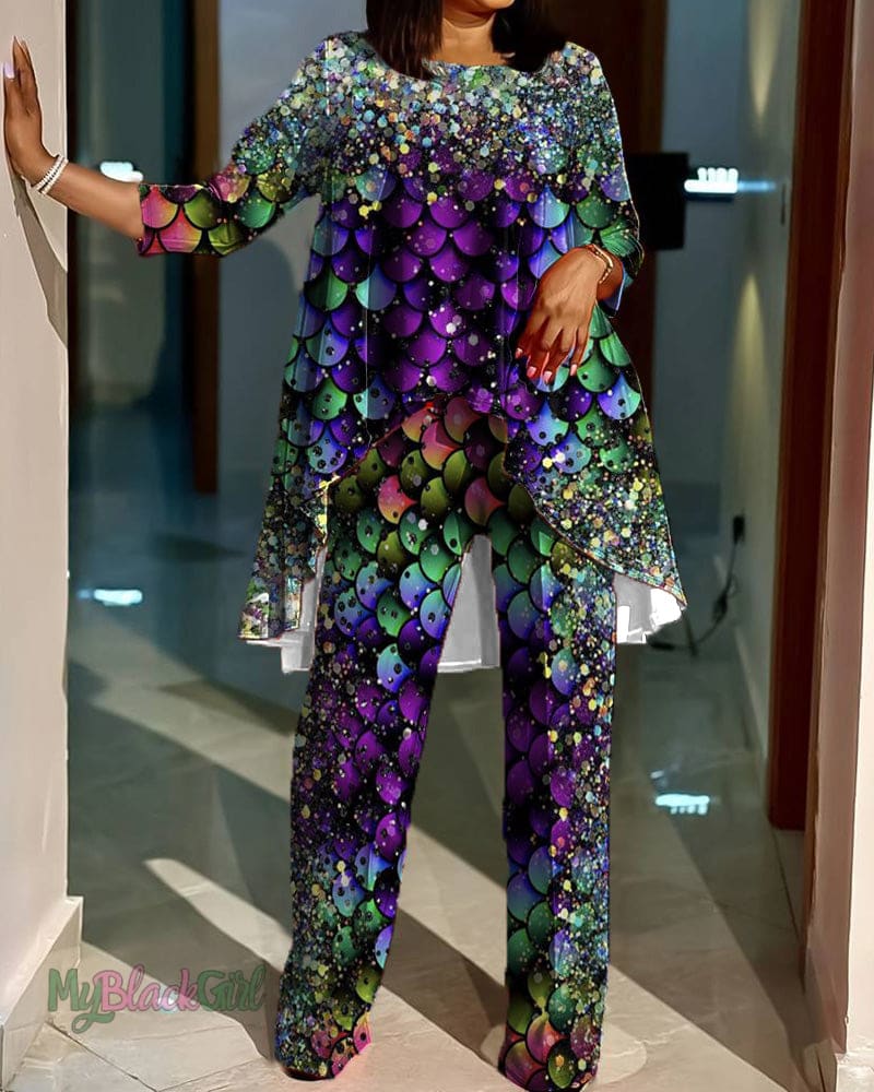 Colorful Sequin Print Irregular Long Sleeve Top Set
