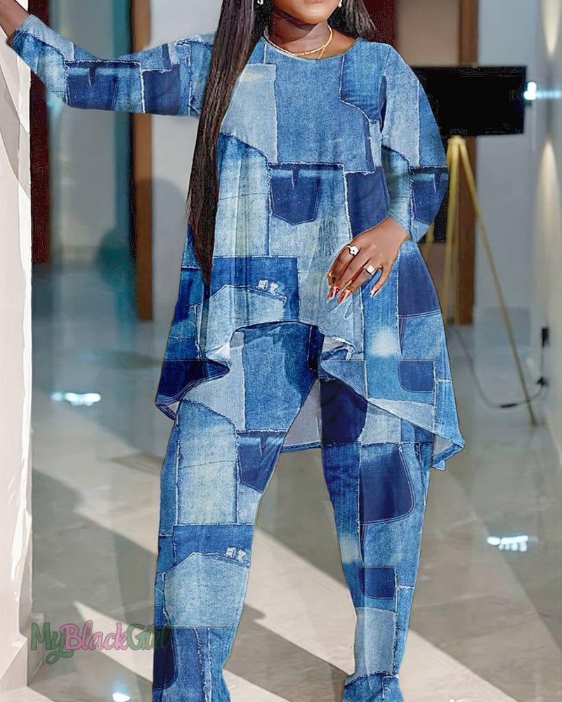 Contrast Color Denim Printed Round Neck Irregular Long Sleeve Women's Suit