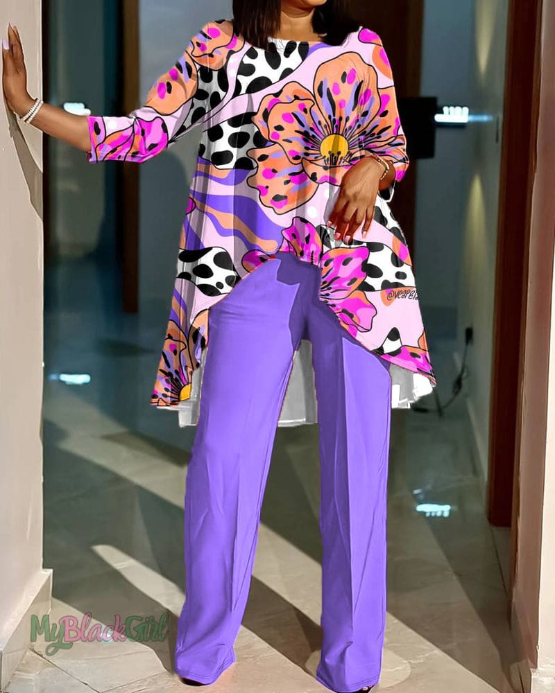 Floral Art Print Irregular Long Sleeve Top Set