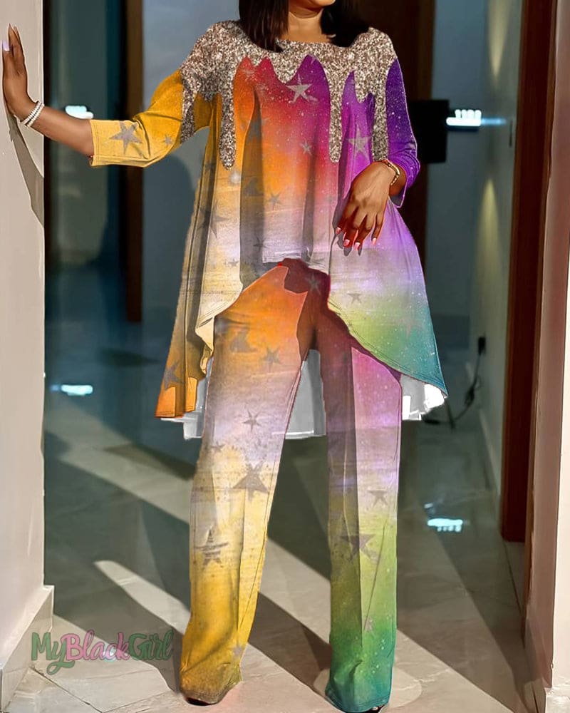 Gradient Star Print Irregular Long Sleeve Top Set
